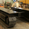 履帶板采用高單齒板,抓地力強,增加與地面的摩擦,接地比壓小,提高了爬坡能力和行走的穩定性,行走液壓馬達采用前置安裝,減小了導向輪在上坡時對張緊機構的負荷,提高了使提高了使用壽命。